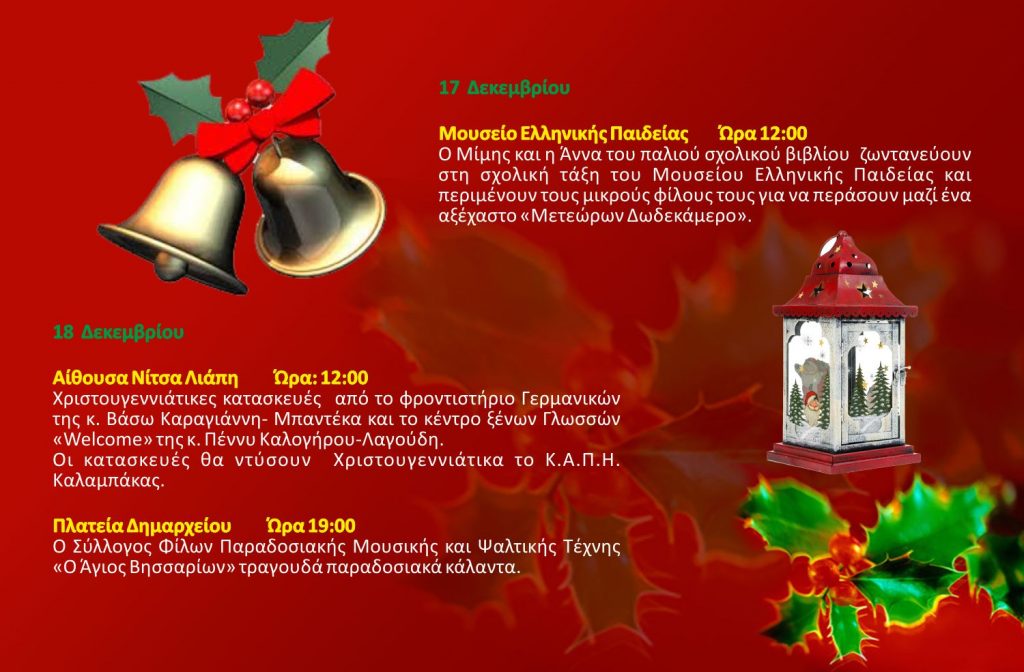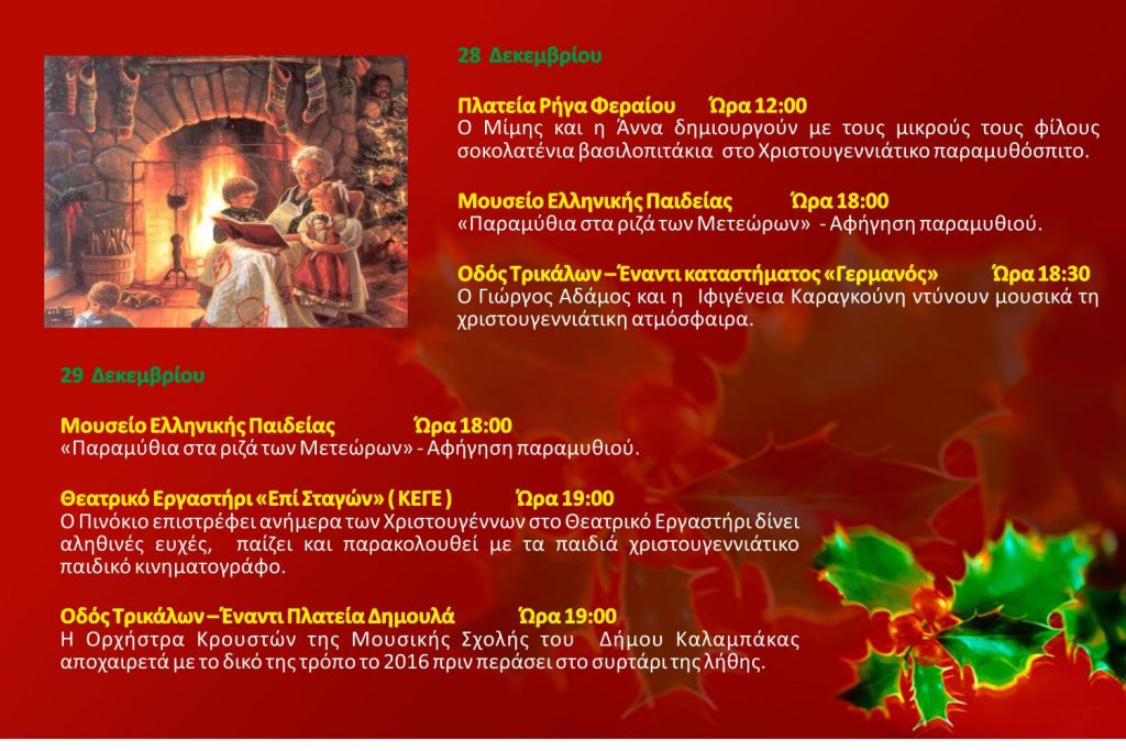 Χριστουγεννιάτικα τραγούδια από την Παιδική Χορωδία του Δήμου Καλαμπάκας και χριστουγεννιάτικη αγορά από κατασκευές των παιδιών της χορωδίας. Τα έσοδα θα διατεθούν για φιλανθρωπικό σκοπό.